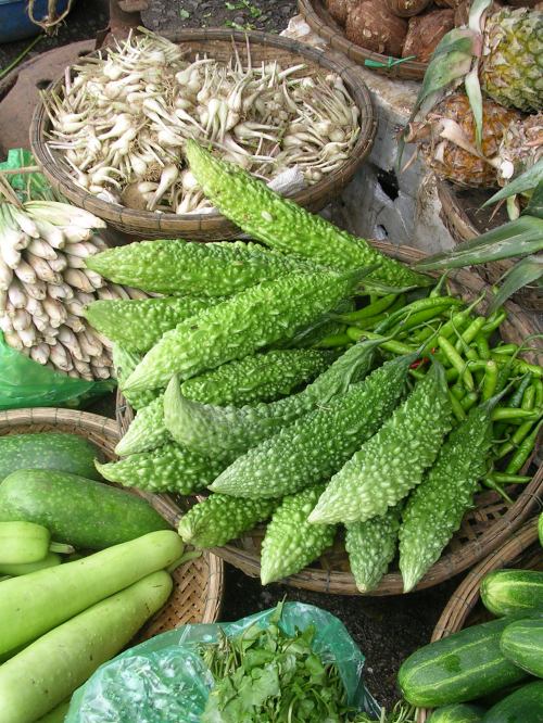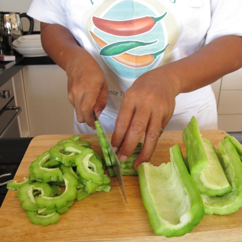 Wait—you are eating luffa? Yes, in Thailand luffa fruit is eaten at a young stage as a vegetable. It is soft, sweet and aromatic after cooking, either in a stir-fry or a soup dish. We eat the whole fruit except for the skin.